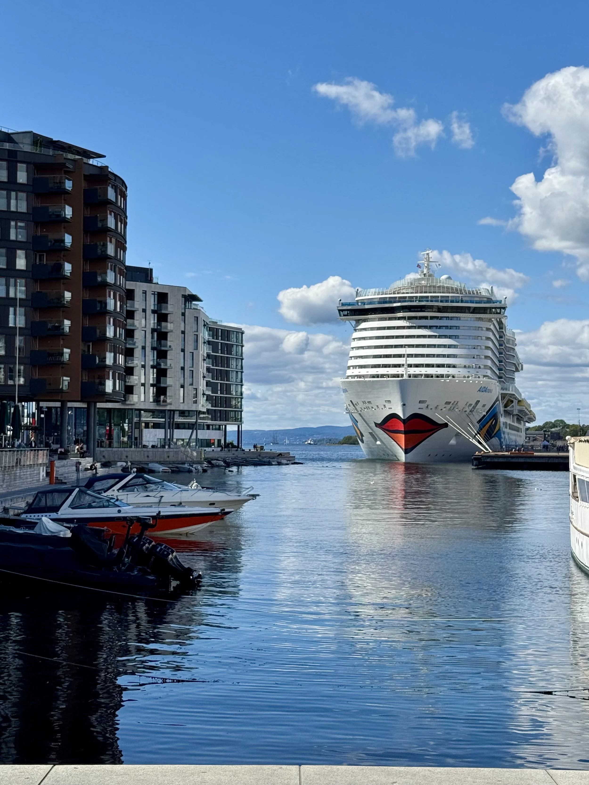 Fjord ferries come and go. Large Color Line ferries depart for ports further down the Oslo fjord which is 100 km/600 miles long. Some take passengers to Denmark or Germany. Cruise ships dock, enabling tourists to disembark for a day trip in the city.
